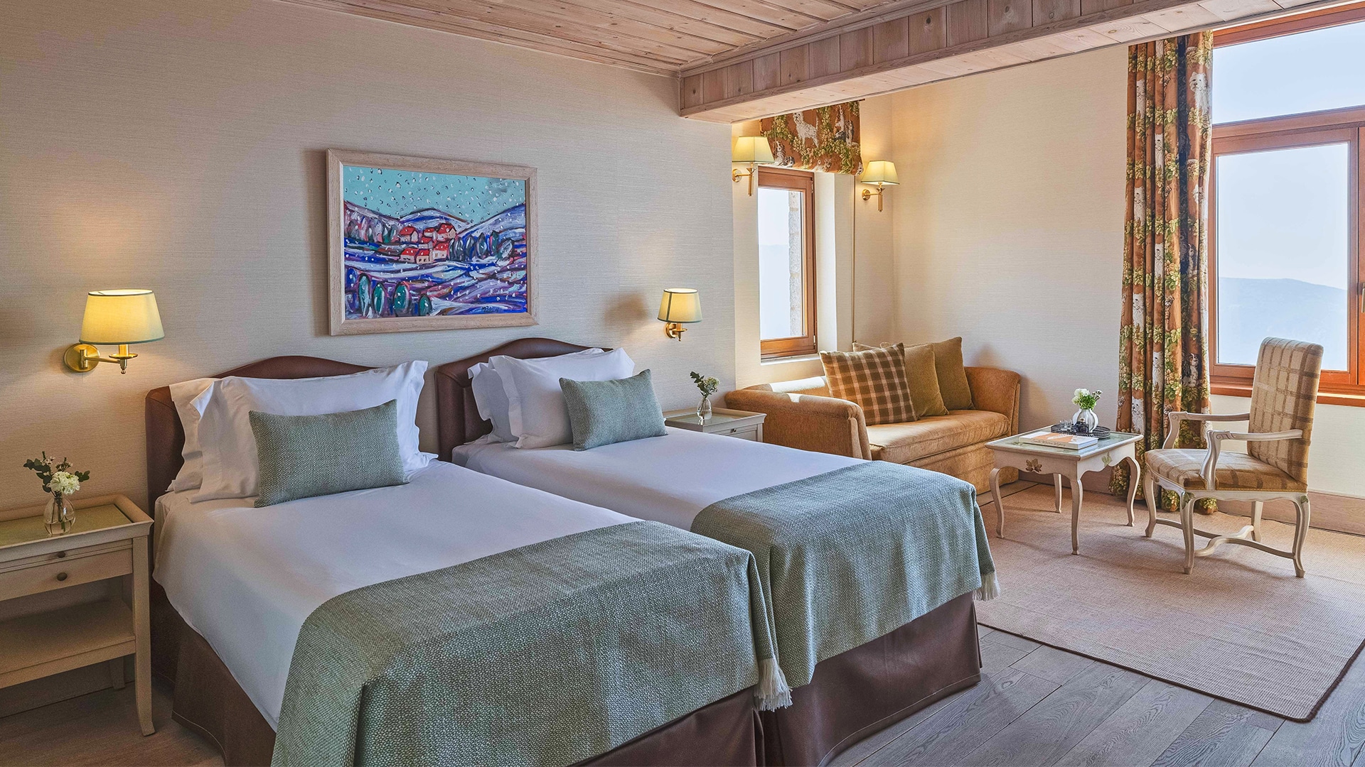 Ideal for families or groups of friends, this two-level maisonette combines social space with peaceful privacy. This spacious suite features two bedrooms, a decorative fireplace, and a cozy balcony. Two bathrooms, one with a bathtub and the other with a shower, provide convenience for all guests. This suite accommodates up to five people with one large double bed, two single beds, and an extra bed on the lower level, upon request. The interior spans up to 60 m² (646 ft²), offering generous space for a relaxing stay.